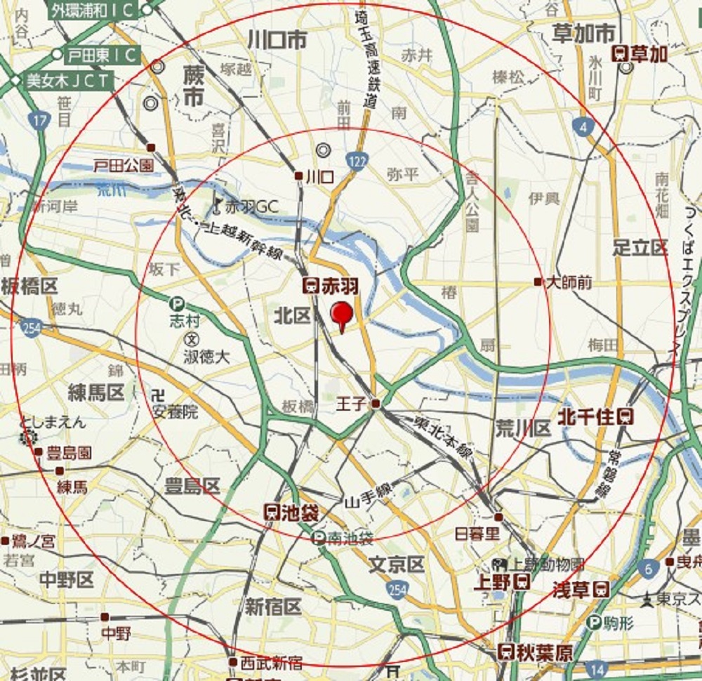 遠いお客様にはよりよいサービスが提供しずらいので 営業範囲を設定させていただいてます,原則として下記の市区を営業範囲とさせていただきます。赤丸内(北区東十条の会社から8キロ以内)の方や、かねてより懇意にさせていただいているお客様からご紹介していただいた方はご相談ください。出来る限り対応させていただきます。